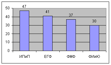Таким образом, количество категорий составило 7 шт.; количество единиц анализа, в целом, составило 137. Количество эссе по факультетам: ИПиП – 47, ЕГФ – 41, ФМФ – 37, ФИиЮ – 30. Всего было: 155 эссе (Рис. 2).