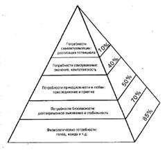 А. Маслоу (1970) сделал предположение, что средний человек удовлетворяет свои потребности примерно в следующей степени: на 85% удовлетворяются физиологические потребности, на 70% - потребность в безопасности и защите, на 50% -потребность в любви и принадлежности к какой-либо социальной группе, на 40% - потребность в самоуважении, на 10% -потребность в самоактуализации. Он считал, что иерархия потребностей присуща всем людям и чем выше по ней поднимется человек, тем большую индивидуальность и психическое здоровье он продемонстрирует. Его основной интерес обращен на потребности самоактуализации. «Чтобы находиться в согласии с собой, музыкант должен создавать музыку, художник рисовать, поэт писать стихи. Человек должен быть тем, чем он может быть. Эту потребность можно называть самоактуализацией» (см. рис. 1)