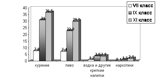 Рис. 1. Возрастная динамика учащихся, приобщенных к курению, употреблению алкоголя (раз в неделю и чаще) и наркотиков, % от общего числа опрошенных.