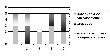 У 80 % респондентов (от общего количества респондентов) наблюдается ориентация на наличие хороших и верных друзей, у 60 % респондентов наблюдается ориентация на физическое и психическое здоровье, 40% ориентированы на материальное благополучие.