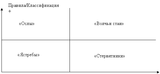 «Ястребы» (слабые правила/классификация обязанностей; слабое вовлечение в группу) – они, как и их прототипы, являются конкурентоспособными индивидами. Их высокое положение в организации нельзя рассматривать как удачу для организации, так как у них есть тенденция создавать свои правила или менять их в свою пользу. Это предприниматели и посредники, профессионалы в сфере инноваций и деятели малого бизнеса. Их цель – сделать так, как они сами того хотят, ради чего они работают над сохранением и усилием своей автономии.