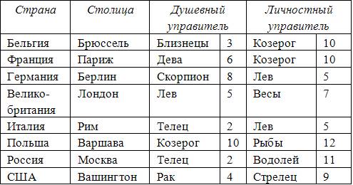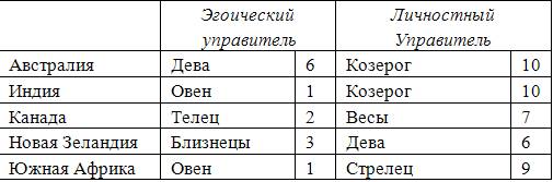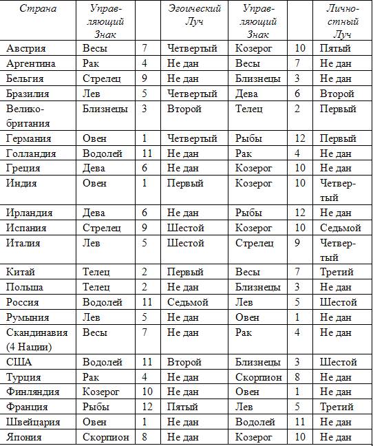 Я покажу вам нынешние личностные влияния наций, обозначенные их управляющими знаками Зодиака, веря, что вы уделите этой информации должное внимание, и заверяя вас, что они имеют сейчас важнейшее значение, особенно если сопоставить их с тем, что я сообщил о Лучах наций в первом томе «Трактата о Семи Лучах ». Напоминаю, что в течение веков нации несколько раз перерождаются или приходят в воплощение в новой форме, которую мы можем называть периодом – если он несущественный, или цивилизацией – если она играет значительную и достаточно драматическую роль. Поэтому личностный Луч и управляющие влияния часто меняются; об этом подчас забывают, потому что названные циклы намного продолжительнее циклов человеческого воплощения. Отмечу также, что данные в приведенных таблицах не всегда совпадают с общепринятым представлением о зодиакальных знаках различных стран. Я даю два знака для каждой страны. Один показывает влияние, которое управляет Эго, или душой, страны или нации, другой – тот, который управляет нынешним личностным Лучом страны и таким образом обусловливает массы.