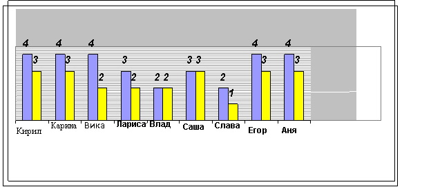 Для создания экспериментальной группы, проанализировав индивидуальные данные (рис. 3), полученные с помощью психодиагностики, были отобраны 9 учеников 2 «А» класса, имеющие уровень развития долговременной и кратковременной памяти ниже среднего. С ними была проведена коррекционная работа по развивающей программе во время промежуточных каникул в конце III учебной четверти (с 23.03.10 по 31.03.10).