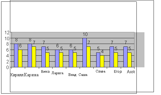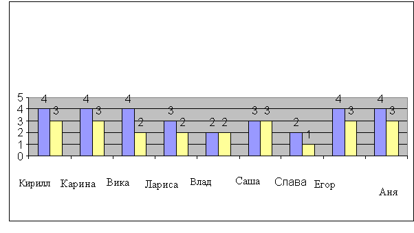 На данном графике видно, что уровень долговременной памяти (1-й столбик синего цвета) и кратковременной памяти (2-й столбик желтого цвета) у всех учащихся находятся в пределах «ниже нормы».