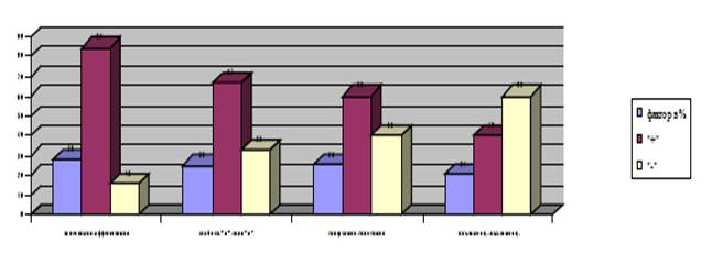Результаты эксперимента показывают, что в целом для выборки характерен высокий уровень стремления к общению, сотрудничеству с окружающими. На рисунке видно, что самый высокий процент количественных показателей по фактору А, который характеризует уровень общительности, приходитсяна аффектотимию – 84%. Количество испытуемых, результаты которых соответствуют низким показателям по фактору А, то есть шизотимии, составляет 16%.