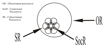 Социальная Реальность (SocR- SocialReality)(Рис.3) это точки соприкосновения, одинаковые содержания SR разных личностей. Последнее может проявится в виде коллективных убеждений, ценностей, мировоззрений и т.д. По словам Дж.Беркли (G.Berkeley), это и есть одновременность одних и тех же восприятий у многих людей, которые по его мнению и есть доказательство “реальности” этих восприятий [1, 261].