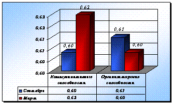 Баллы по параметру «коммуникативные способности» в диапазоне от 0,56 – 0,65 указывают на средний уровень развития данных способностей, который выражается в том, что студенты охотно проявляют лидерское поведение, отстаивают своё мнение, однако потенциал их способностей не отличается устойчивостью.