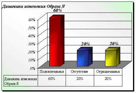 Результаты, полученные до и после эксперимента, были сопоставлены и условно разделены на три группы: «Положительная динамика изменения» Образа Я, «Отсутствие динамики», «Отрицательная динамика» (см. Рис. 10).