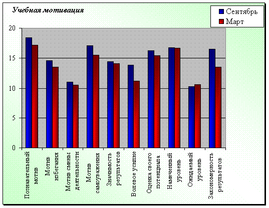| Познавательный мотив | Мотив избегания | Мотив смены деятельности | Мотив самоуважения | Значимость результатов | Волевое усилие | Оценка своего потенциала | Намеченный уровень мобилизации усилий | Ожидаемый уровень результатов | Закономерность результатов | |