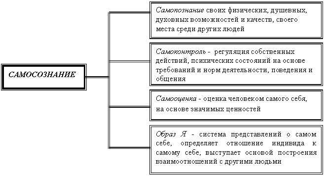 Самосознание как осознание себя может принимать различные формы и проявляться как самопознание, самоконтроль, самооценка и «Образ Я» (см. Рис.1).