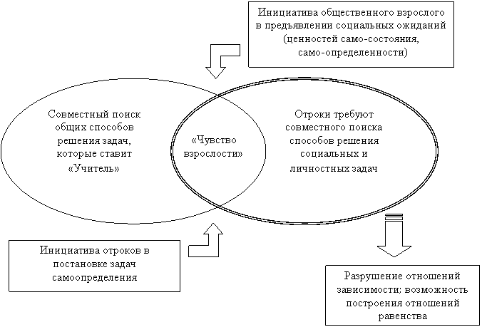 На ступени персонализации, в юности – реальным партнером по общности, с которым каждый отождествляется лично и по-своему, становится общественный взрослый – Учитель, Мастер, Наставник. Взрослый ценен и значим, прежде всего, своей реальной взрослостью, которая содержательно раскрывается, обнаруживает себя через правила, понятия, принципы, способы организации деятельности во всех сферах социально-культурного бытия – в ремесле, науке, искусстве, религии, морали, праве. Именно через приобщение к деятельным формам взрослости человек впервые осознает себя потенциальным автором собственной биографии, принимает персональную ответственность за свое будущее, уточняет границы своей самотождественности внутри совместного бытия с другими (см. Рис. 2).