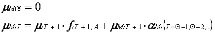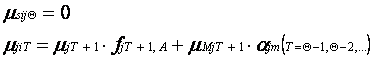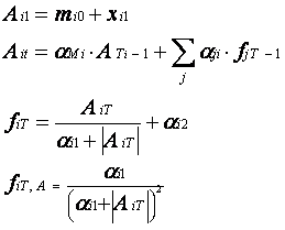 где mi0 - параметр инциации сети, xi1 - входные сигналы сети, поступающие на данный нейрон, fiT - выходной сигнал нейрона на такте времени T, Ai1 - входной параметр i-го нейрона на первом такте функционирования сети, AiT - входной сигнал i-го нейрона на такте времени T, aji - вес синапса от j-го нейрона к i-му, aMi - вес синапся памяти i-го нейрона, ai1 - параметр нейрона и ai2 - параметр спонтанной активности нейрона, AiT-1 - входной сигнал i-го нейрона на такте T-1, fjT-1 - выходной сигнал j-го нейрона на такте T-1 и fiT,A - производная i-го нейрона по его входному сигналу.