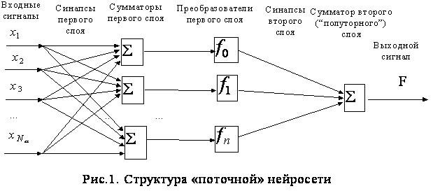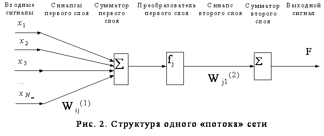 Здесь x1 - xN - входные сигналы сети, Wij(1) - синапсы первого слоя от i-го входа к j-му сумматору первого слоя, Wj1(2) - синапсы второго слоя от j-го преобразователя к выходному сумматору, fj - j-й преобразователь, символом S обозначаются тривиальные сумматоры.