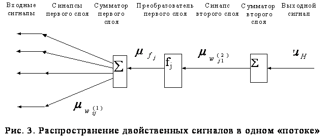 Вычисление производных H (функции ошибки) для сети, представляющего собой один «поток», можно вести на основе аппарата двойственных функций и алгоритма обратного распространения ошибки. Схема прохождения сигналов при обратном функционировании показана на рис. 3.