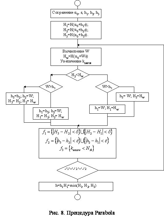 W - величина шага в вершину параболы, проходящей через точки (h1, H1), (h2, H2), ( h3, H3). Вычисляется по формуле: