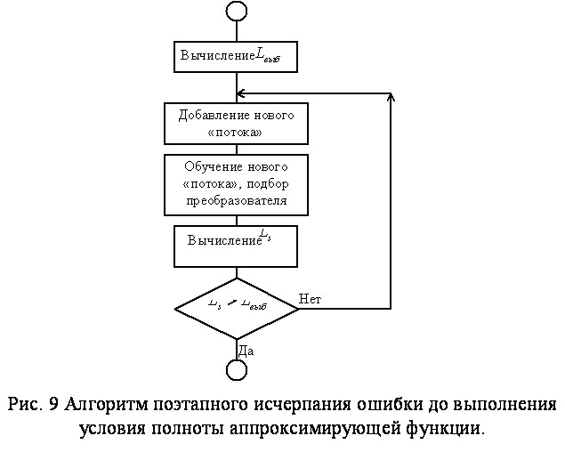Исходя из данного условия, можно сформулировать алгоритм обучения сети с поэтапным исчерпанием ошибки так, как это показано в блок-схеме на рис. 9
