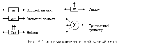 Традиционный состав элементов сети (см. главу 1) включает в себя следующие элементы: нейрон, синапс, сумматор. Кроме того, в число типовых включены входной и выходной элементы.