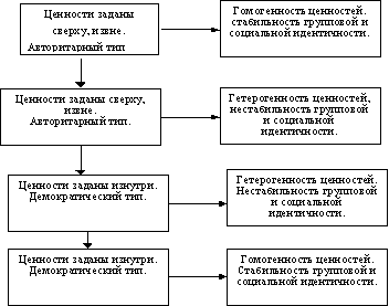 Схему изменений ценностей от авторитарных к демократическим и миграции групповой и социальной идентичности предлагает А.Г. Костинская (2003) Рис 2.2.1 [с. 190].
